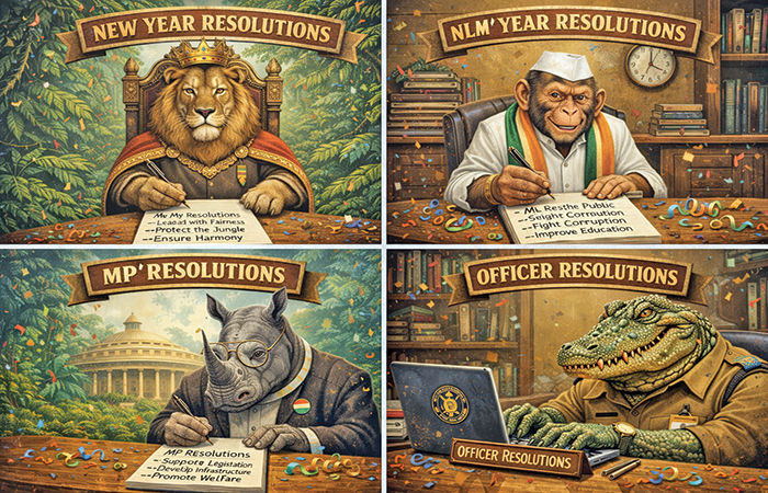 જંગલના રાજા સિંહે પણ મનોમન સંકલ્પ કર્યો: વિપક્ષના નેતા સસલાભાઈ, કાચબાભાઈ કકળાટિયા, વાઘણબહેન, બારહસિંગા વગેરે ભેગાં મળીને મારી ઈમેજ ખરડાવે છે. મને મતદારો સમક્ષ ઉઘાડો પાડે છે. આ વર્ષે હું આ તમામ પર તપાસ એજન્સીઓનો સકંજો વધારે મજબૂત બનાવીશ. આ વર્ષે એક-બે વિપક્ષના નેતાને જેલમાં ધકેલવા જરૂરી વ્યૂહ ગોઠવીશ. ફરીથી જંગલની નાની-મોટી ચૂંટણીઓ જીતી બતાવીને મારી લોકપ્રિયતા, મહાનતા સાબિત કરીશ. જંગલની સરકારી યોજનાઓમાં મારા વધુ સારા ફોટોઝ આવે તે માટે તાકીદે નવું ફોટોશૂટ કરીશ.
