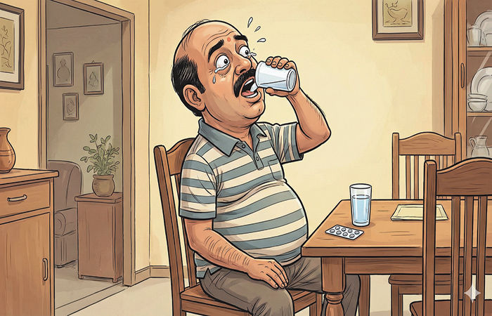 મેં નવાઈ પામી પૂછયું કે 'શોલે' ફિલ્મના ડાયલોગને મીઠું અને દવાની ગોળી સાથે શું સંબંધ? પથુકાકા હસીને બોલ્યા, ''શોલે'નો ડાયલોગ યાદ કરઃ સરદાર, સરદાર... મૈંને આપકા નમક ખાયા હૈ. ત્યારે ગબ્બરસિંહ કહે છેને કે, અબ ગોલી ખા... મારા ડોકટર પણ ગબ્બરનો જ ડાયલોગ દોહરાવે છેને? નમક ખાધું છે તો હવે ગોળી ખા...'
