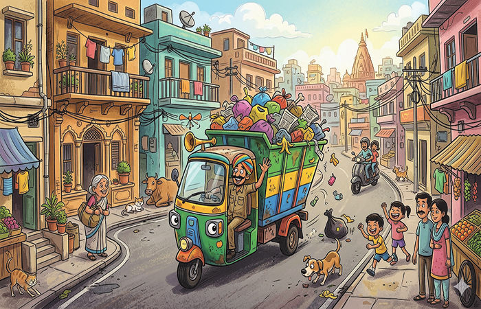 આ સાંભળતાની સાથે જ પથુકાકા બોલી ઉઠયા, 'મુંબઈમાં ઘંટાગાડી કચરો ભેગો કરવા આવે છે ને? એ ડંકા વગાડી કચરો ભેગો કરે છે, પણ તારી આ (હો)બાળાકાકીના પિયરને ગામ વડોદરામાં તો રીતસર લાઉડ સ્પીકરમાં ગીત વગાડતી વગાડતી કચરાગાડી આવે છે અને જુદા જુદા એરિયામાંથી કચરો ભેગો કરીને જાય છે. અગાઉ મોટા અવાજે ગીત કાને પડે કે- ગાડીવાલા આ ઘર સે કચરા નિકાલ.... ગાડીવાલા આયા ઘરે સે કચરા નિકાલ.... આ સાંભળતાની સાથે લોકો ઘરથી કચરો કાઢીને ગાડીમાં ઠાલવવા પહોંચી જાય.'