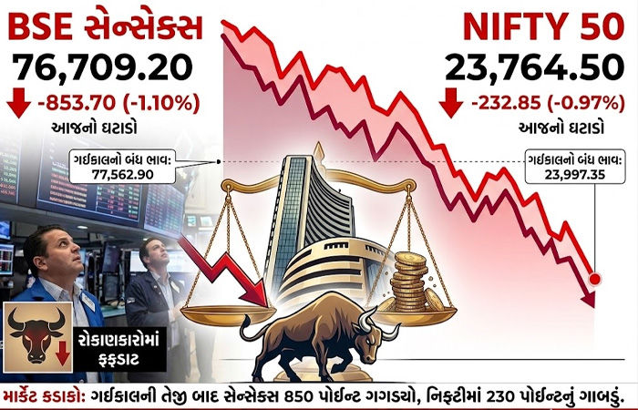 માહિતી મુજબ, BSE સેન્સેક્સ ગઈકાલના 77,562.90ના બંધ ભાવ સામે આજે 77,319.33 પર ખુલ્યો હતો. જોકે, બજાર ખુલતાંની સાથે જ તેમાં સતત ઘટાડો જોવા મળ્યો અને સમાચાર લખવા સુધીમાં સેન્સેક્સ 853.70 પોઇન્ટ (-1.10%) તૂટીને 76,709.20ના સ્તર પર પહોંચી ગયો છે. દિવસ દરમિયાન સેન્સેક્સ 76,676.53ની નીચી સપાટીએ પણ સ્પર્શ્યો હતો.