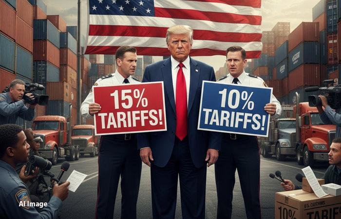 અમેરિકામાં 10 ટકા ટેરિફ લાગુ થશે કે 15 ટકા, તેને લઈને અંદરખાને ખેંચતાણ જોવા મળી રહી છે. એક તરફ, અમેરિકન કસ્ટમ વિભાગે (CBP) મંગળવારે એક નોટિસ જારી કરીને તમામ આયાતી માલ પર 10 ટકા ટેરિફનો અમલ શરૂ કરી દીધો છે. બીજી તરફ, ટ્રમ્પ પ્રશાસન મક્કમ છે કે તેઓ આ ટેરિફને 15 ટકા સુધી વધારવા પર કામ કરી રહ્યા છે. વ્હાઇટ હાઉસના અધિકારીએ સ્પષ્ટ કર્યું છે કે 15 ટકા ટેરિફ લાદવાના નિર્ણય પર ટ્રમ્પનો વિચાર બદલાયો નથી.