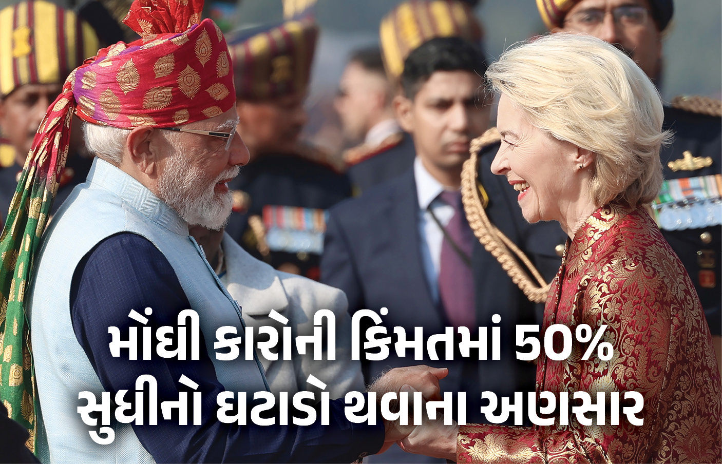 India–EU FTA Deal Impact On Cars Price : ભારત અને યુરોપિયન યુનિયન વચ્ચે આવતીકાલે 27 જાન્યુઆરીએ 'મધર ઓફ ઓલ ડીલ' એટલે કે ઐતિહાસિક વેપાર કરાર થવાનો છે. બંને વચ્ચે જે ‘મુક્ત વેપાર કરાર’ થવાનો છે, તેમાં મોંઘી લક્ઝુરિયસ કારની ડીલ પણ સામેલ છે. આ ડીલ માટે યુરોપિયન કમિશનના અધ્યક્ષ ઉર્સુલા વોન ડેર લેયેન હાલ ભારતની મુલાકાતે છે અને આવતીકાલે તેઓ અને વડાપ્રધાન નરેન્દ્ર મોદી સાથે બેઠક કર્યા બાદ ભારત-ઈયુ ડીલ અંગે મોટી જાહેરાત કરી શકે છે. ડીલમાં મોંઘી લક્ઝુરિયસ કારનો પણ સમાવેશ હોવાનો રિપોર્ટ સામે આવ્યો છે, જેમાં ભારત સરકાર યુરોપીય યુનિયનથી આવતી કારો પરની આયાત ડ્યૂટીમાં મોટી કપાત કરવાની તૈયારીમાં છે. હાલ યુરોપથી ભારત આયાત થતી કારોનો પરની ઈમ્પોર્ટ ડ્યૂટી 110 ટકા સુધી પહોંચી ગઈ છે, જેમાં 40 ટકા ઘટાડો કરવાનો પ્રસ્તાવ છે.