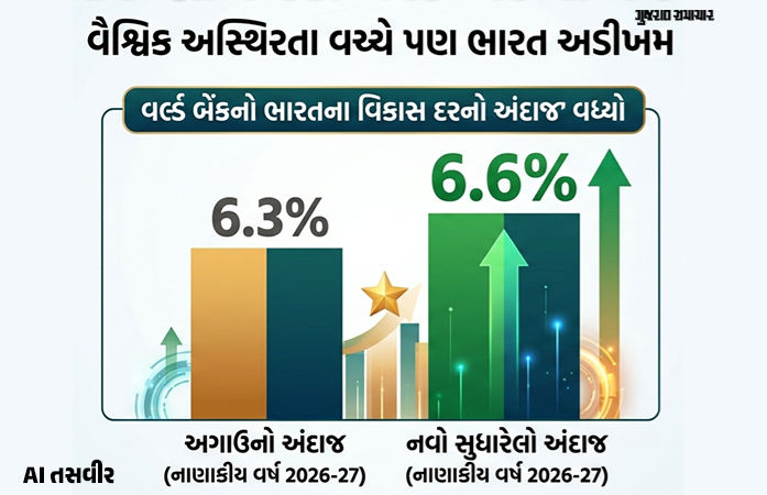 વર્લ્ડ બૅંકે બુધવારે 'સાઉથ એશિયા ઈકોનોમિક અપડેટ' જાહેર કર્યું હતું. આ અપડેટમાં જ ભારતીય અર્થતંત્રને લઈને અંદાજમાં વધારો કરવામાં આવ્યો છે. વિશ્વ બૅંકનું અનુમાન છે કે ભારત દક્ષિણ એશિયામાં વિકાસનું મુખ્ય એન્જિન બની રહેશે. નાણાકીય વર્ષ 2026-27 માટે ભારતના GDP( ગ્રોસ ડોમેસ્ટિક પ્રોડક્ટ)વૃદ્ધિ દરના અંદાજને જે અગાઉ 6.3% હતો, તેને હવે સુધારીને 6.6% કરવામાં આવ્યો છે. આ વૃદ્ધિ ભારતની આર્થિક મજબૂતી અને વિકાસની સંભાવનાઓને દર્શાવે છે, જે દેશના ભવિષ્ય માટે સકારાત્મક સંકેત છે.