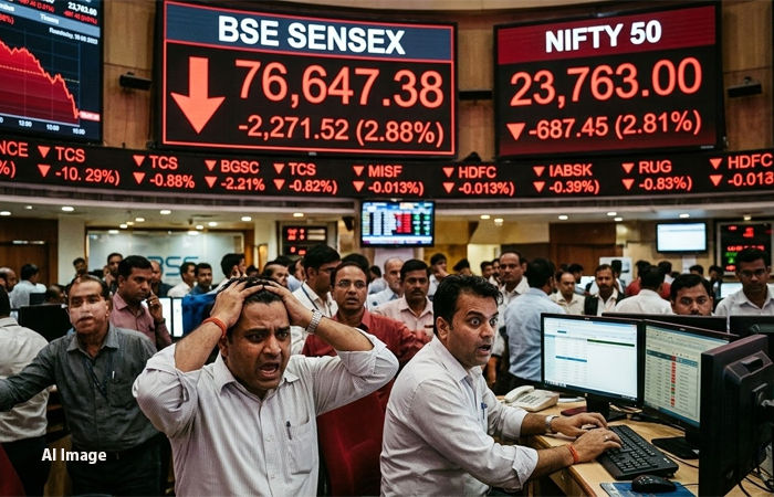 મિડલ ઈસ્ટમાં વધતાં જતાં સૈન્ય સંઘર્ષની સીધી અસર આજે ભારતીય શેરબજાર પર જોવા મળી છે. બજાર ખુલતાંની સાથે જ સેન્સેક્સ અને નિફ્ટીમાં ગાબડાં પડ્યા હતા. BSE SENSEX આજે પ્રચંડ કડાકા સાથે 76,647.38ના સ્તર પર પહોંચી ગયો હતો, જે તેના અગાઉના બંધ 78,918.90ની સરખામણીએ 2,271.52 (2.88%) પોઇન્ટનો તોતિંગ ઘટાડો દર્શાવે છે. આજના ટ્રેડિંગ સત્ર દરમિયાન બજાર 77,056.75 પર ખુલ્યું હતું અને નીચામાં 76,641.26 સુધી ગગડ્યું હતું.