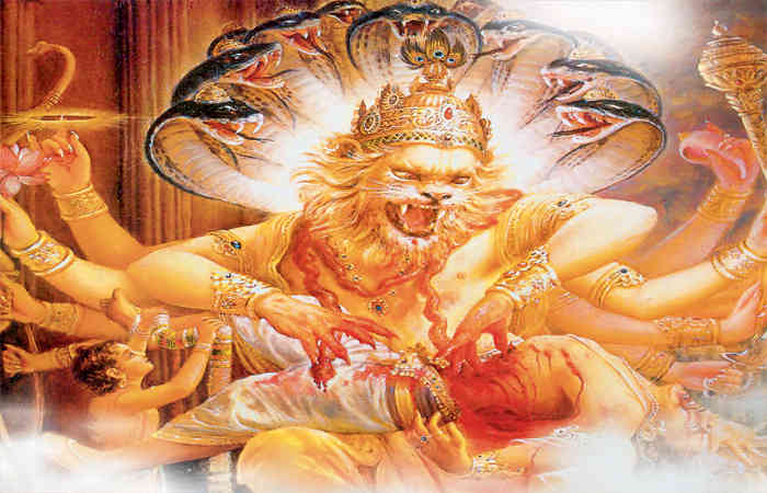 શ્રી મદ્ ભાગવતમાં આવતી એક કથા અનુસાર કહીએ તો સમ્રાટ હિરણ્યકશિપુ રાક્ષસરાજ હતો. તેનું જીવન ખૂબ ભોગપ્રધાન. ખાઓ, પીઓ અને મજા કરો એ જ તેની મનોવૃત્તિ હતી. તેના રાજ્યમાં પ્રજા અનેક પ્રકારનાં કષ્ટો ભોગવતી હતી. દરેક રીતે સ્વાર્થી અને ઘમંડી એવો હિરણ્યકશિપુ પોતાની જાતને જ ભગવાન સમજતો હતો. તેણે વરસો સુધી તપ કરીને બ્રહ્માજીને પ્રસન્ન કર્યા. એટલે તેમણે આવી તેને વરદાન માગવા કહ્યું. હિરણ્યકશિપુએ બ્રહ્માજી પાસે માગ્યું : 'હું દિવસે ન મરું, રાત્રે ન મરું, ઘરમાં ન મરું.' 'તથાસ્તુ' કહી બ્રહ્માજીએ તેને વરદાન આપ્યું. આવુ વરદાન મળ્યા પછી તેનું અભિમાન અનેક ગણંમ વધી ગયું. દેવોને પણ તે પજવવા લાગ્યો. આથી બધા દેવો ભેગા મળીને ભગવાન વિષ્ણુ પાસે ગયા અને કહ્યું : 'ભગવંત ! આ રાક્ષસ અમને ખૂબ ત્રાસ આપે છે, માટે તેનો નાશ કરો.' ભગવાને કહ્યું : જ્યારે તે મારા ભક્ત પ્રહલાદને દુ:ખ આપશે ત્યારે હું તેનો નાશ કરીશ.