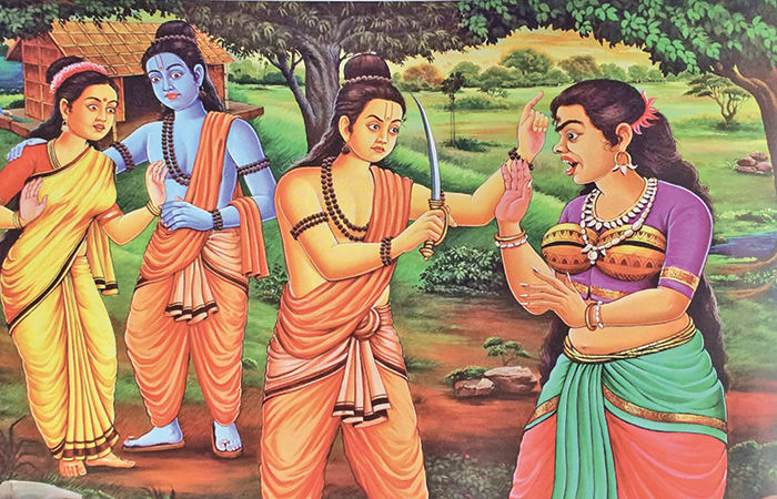 કામાતુર શૂર્પણખા લક્ષ્મણજી પાસે જાય છે. લક્ષ્મણજી તે વખતે પોતાની કટારને ધાર કાઢવામાં મશગૂલ છે. તેના તરફ જોયા વગર કહે છે : હું તો તેમનો દાસ છું. દાસની સાથે રહીને તું સુખ પામી શકીશ નહીં. માટે તેમની પાસે જા. આમ એકબીજા સાથે ધકેલાતી. અપમાનીત થતી શૂર્પણખા ક્રોધિત થાય છે. વિકરાળ રૂપ ધારણ કરે છે. તે વિચારે છે આ સીતા મારી વચ્ચે આડખીલીરૂપ છે તેથી સીતાજીને મારવા દોડે છે ત્યારે લક્ષ્મણજી તેનાં નાક અને કાન કાપીને તેને કુરૂપ કરે છે.