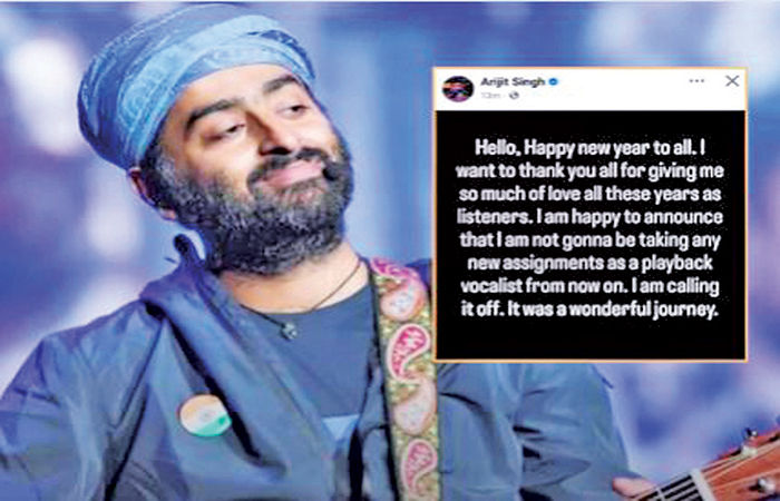 મુંબઈ : બોલિવુડના હાલની પેઢીના ગાયકોમાંથી સૌથી લોકપ્રિય અરિજિતસિંઘે આજે સિંગિંગમાંથી નિવૃત્તિની જાહેરાત કરતાં તેના લાખો ચાહકો શોકમાં ગરકાવ થઈ ગયા હતા. અરિજિતે એક સોશિયલ મીડિયા પોસ્ટ દ્વારા આ જાહેરાત કરી હતી.
