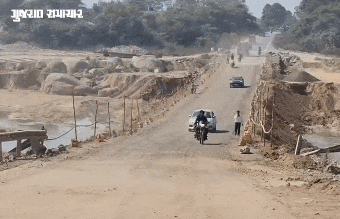 Chhota Udepur News : છોટાઉદેપુર જિલ્લાના પાવીજેતપુર નજીકથી પસાર થતી ભારજ નદી ઉપરનો બે વર્ષ પહેલા બ્રિજ તૂટી પડતા રાહદારીઓ માટે નદીના પટમાં 6 કરોડના ખર્ચે અગાઉ બે વાર ડાયવર્ઝન બનાવ્યું હતું. જોકે, પાણીના પ્રવાહના કારણે ડાયવર્ઝન ધોવાય જતાં ફરીથી નવું ડાયવર્ઝન બનાવીને રાહદારી માટે ખુલ્લું મૂકવામાં આવ્યું હતું. પરંતુ તેમાં કોન્ટ્રાક્ટર દ્વારા વેઠ ઉતારવામાં આવી હોવાનો સ્થાનિકોએ આક્ષેપ કર્યો છે. સ્થાનિકોએ જણાવ્યું કે, ડાયવર્ઝનની કામગીરીમાં લોખંડની કે પાકી પેરાફિટની જગ્યાએ વાંસ લગાવ્યા હોવાથી રાહદારીઓ પર જીવનું જોખમ વર્તાઈ રહ્યું છે.