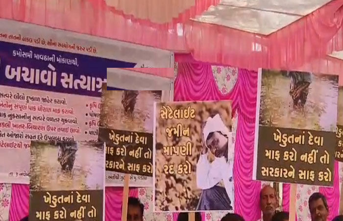 આજે અમરેલી જિલ્લામાં વડીયા અને બગસરામાં ખેતી બચાવો સત્યાગ્રહનામંડાણ શરૂ કરાયા હતા. આ બાબતે અમરેલી જિલ્લાના આગેવાનોએ પ્લે કાર્ડ અને બેનરો સાથે ધરણા પ્રદર્શન કરી રેલી યોજી હતી. એ પછી બળદગાડામાં બેસી મામલતદાર કચેરીએ પહોંચી ખેતીને થયેલા નુકસાનની વિગતો આપી આવેદન આપ્યું હતું. આ તકે ખેડૂતોએ માથા પર બગડેલી મગફળી અને અન્ય પાકોના ટોપલા ભરીને મામલતદાર કચેેરીએ પહોંચ્યા હતા. વડીયામા ખેડૂતોની મોટી હાજરી વચ્ચે આગેવાનોએ કહ્યું હતું કે સરકાર ઉદ્યોગોને કરોડો રૂપિયા દેવામાફી કરે છે તો ખેડૂતોને શા માટે નહીં ? બગસરામાં ધરણા થયા હતા.