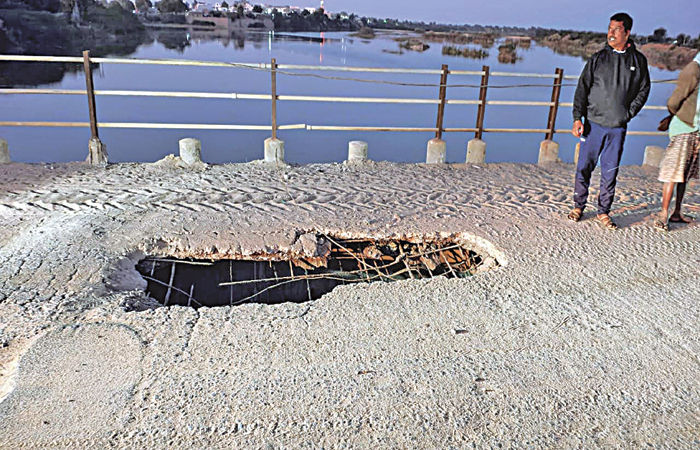 - જાહેરનામુ છતાં ઓવરલોડ ડમ્પરો પુલ પર દોડતા હોવાનો આક્ષેપ : યુદ્ધના ધોરણે પુલનું સમારકામ કરવા માંગ