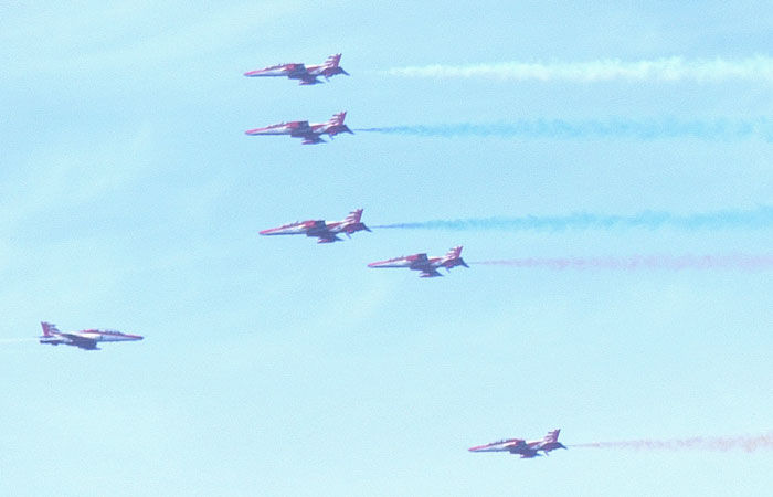 બાદમાં મુખ્ય શોમાં જામનગર કે જ્યાં એરફોર્સનું મથક છે ત્યાંથી 9 વિમાનો ઉડયા હતા જેણે રાજકોટના આકાશમાં આવીને રોમાંચક અને દિલધડક કરતબો રજૂ કર્યા હતા. એક લાઈનમાં એરો આકારમાં ધસમસતા તેમજ ધુમ્રસેર છોડતા વિમાનો, આકાશમાં વિમાનોથી દિલનો આકાર , તિરંગો, સામસામા ધસમસતા અને સ્ટન્ટ દર્શાવતા વિમાનો જોઈને ઉપસ્થિત મેદની રોમાંચિત થઈ હતી. આ વિમાનો આકાશમાં 90 ડીગ્રીએ ઉપર જઈને નીચે આવતા જોઈને સૈન્યના શૌર્ય, એક સેકન્ડની પણ ભૂલ વગરનું ટાઈમ મેનેજમેન્ટ,કૌશલ્યનો પરચો મળ્યો હતો. છેલ્લે 8000 ફૂટની ઉંચાઈ ઉડતા વિમાનમાંથી છ જવાનો પેરેશૂટથી જમ્મ કર્યો અને તીવ્ર ગતિએ જમીન ભણી અટલ સરોવરના કાંઠે ઉતરીને સાહસ અને સજ્જતાનો પરિચય આપ્યો હતો. આવતીકાલે સવારે 10 વાગ્યે આ શો નિમિત્તે રવિવારના કારણે વિશેષ મેદની ધ્યાને લઈને અટલ સરોવરથી રીંગરોડ સુધીના માર્ગો વાહનો માટે પ્રવેશબંધી જાહેર કરી છે અને પાર્કિંગ પ્લોટ્સ વધારાયા છે.