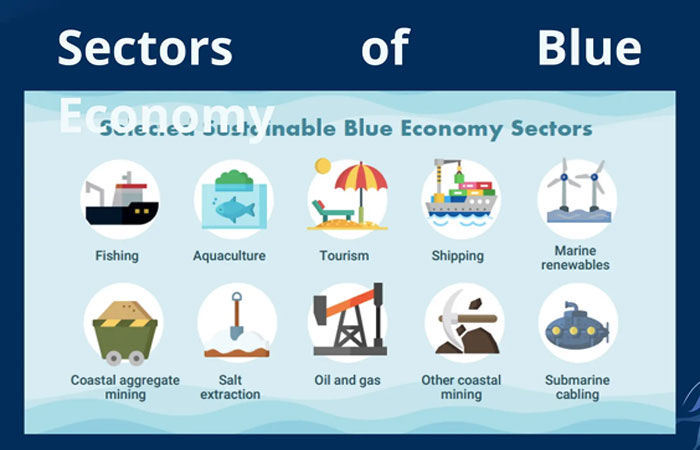 બ્લૂ ઇકોનોમી એટલે શું ? બ્લૂ ઇકોનોમીનો અર્થ માત્ર માછીમારી કે જહાજવાડાથી જ નથી, પરંતુ સમુદ્ર આધારિત સમગ્ર આથક માળખાનો સમાવેશ થાય છે. જેમાં મરીન બાયોટેક્નોલોજી, ગ્રીન એનર્જી, ગહન સમુદ્ર સંશોધન, ઇકો-ટુરિઝમ, પોર્ટ- લોજિસ્ટિક્સ અને સ્માર્ટ ફિશિંગ વગેરેનો સમાવેશ થાય છે.