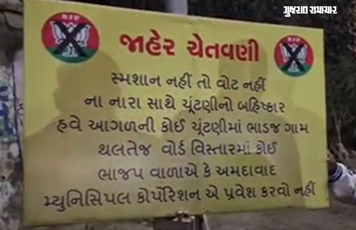 અમદાવાદના પશ્ચિમ વિસ્તારમાં આવેલા થલતેજ વોર્ડના ભાડજ ગામમાં સ્થાનિક સુવિધાઓના અભાવે જનઆક્રોશ ફાટી નીકળ્યો છે. લાંબા સમયથી સ્મશાનગૃહની માંગણી સંતોષવામાં ન આવતા ગ્રામજનોએ આક્રમક વલણ અપનાવ્યું છે. વિકાસના દાવાઓ વચ્ચે પાયાની જરૂરિયાત ગણાતી સ્મશાનની સુવિધા ન મળતા ગ્રામજનોએ એકસૂરે આગામી ચૂંટણીઓના બહિષ્કારની ચીમકી ઉચ્ચારી છે અને ગામના પ્રવેશદ્વારો પર વિરોધ પ્રદર્શન કરતા બોર્ડ લગાવી દીધા છે.