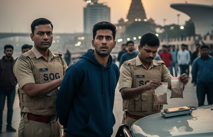 SOG ક્રાઈમ બ્રાન્ચની ટીમને 10 ફેબ્રુઆરીએ ચોક્કસ બાતમી મળી હતી કે, પતંગ હોટલની પાછળ અને મહાકાળી માતાના મંદિરની સામે રિવરફ્રન્ટ રોડ પર હૂડી જેકેટ અને બ્લુ જીન્સ પહેરેલો એક શખ્સ વેચાણ માટે MD ડ્રગ્સ લઈને ફરી રહ્યો છે. બાતમીના આધારે SOG ની ટીમે સાંજે લગભગ 7 વાગ્યે મહાકાળી માતાના મંદિર પાસે શંકાસ્પદ શખ્સને અટકાવ્યો હતો.