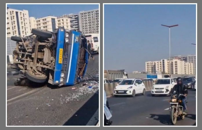 Ahmedabad News: અમદાવાદમાં SG હાઈવે પર સોલા બ્રિજ પરથી પસાર થઈ રહેલી એક આઈસર ટ્રકનું ટાયર અચાનક ફાટતા ટ્રક રોડની વચ્ચે જ પલટી ખાઈ ગઈ હતી. આ અકસ્માતને પગલે હાઈવે પર ટ્રાફિકના દ્રશ્યો સર્જાયા હતા અને વાહનચાલકો કલાકો સુધી અટવાયા હતા. સદનસીબે આ ભયાનક અકસ્માતમાં કોઈ જાનહાનિ થઈ નથી.