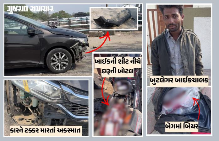 બાઈકચાલકે અતિશય માત્રામાં દારૂ પીધો હતો કે ભાનમાં પણ નહોતો કે શું થયું છે. કારમાં સવાર પરિવાર લગ્ન પ્રસંગમાં જઈ રહ્યો હતો, ત્યારે બાઈકચાલકે ટક્કર મારતા અકસ્માત સર્જાયો હતો. જેને લઈને કારચાલકે બાઈકસવારનું ચેકિંગ કરતાં બાઈક અને તેની બેગમાં દારૂ ભરેલો જોવા મળ્યો હતો. ઘટનાને લઈને કારચાલકે વીડિયો બનાવી વાઈરલ કર્યો હતો. સમગ્ર મામલે કારચાલકે પોલીસને જાણ કરતા પોલીસે બાઈકચાલક બુટલેગરની ધરપકડ કરીને આગળની કાર્યવાહી હાથ ધરી છે.
