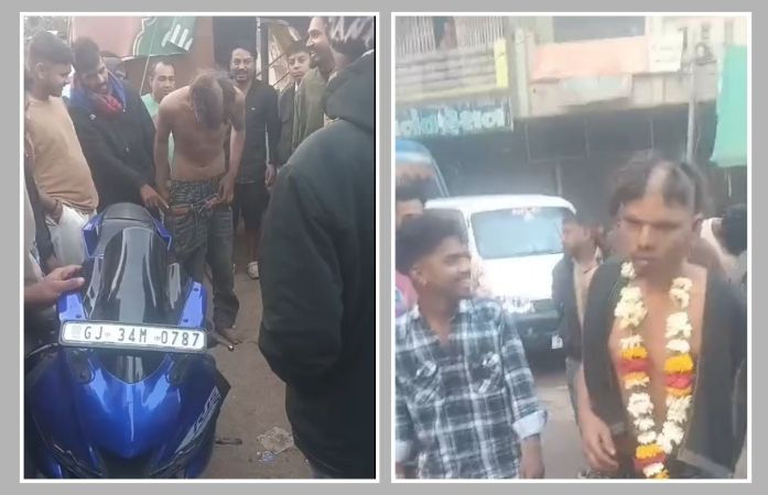 Chhota Udaipur News: છોટાઉદેપુરના કવાંટ વિસ્તારમાં બાઇક ચોરી કરી ભાગી રહેલા એક ચોરને લોકોએ રંગેહાથ ઝડપી પાડી, પોલીસને સોંપવાને બદલે જાહેરમાં સજા આપી હોવાનો કિસ્સો પ્રકાશમાં આવ્યો છે. ભીડ દ્વારા ચોરને અર્ધનગ્ન કરી, તેનું મુંડન કરાવીને હાર પહેરાવી આખા ગામમાં તેનો વરઘોડો કાઢવામાં આવ્યો હતો. આ સમગ્ર ઘટનાનો વીડિયો સોશિયલ મીડિયા પર જોરશોરથી વાયરલ થઈ રહ્યો છે.