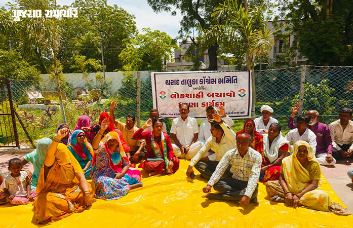 Congress Protest In Tharad: ભાજપ સરકાર દ્વારા લોકશાહીના મૂલ્યોના થઈ રહેલા કથિત હનન અને ભ્રષ્ટ વહીવટના વિરોધમાં શુક્રવારે(17 એપ્રિલ, 2026) થરાદ તાલુકા કોંગ્રેસ સમિતિ દ્વારા થરાદ પ્રાંત અધિકારીની કચેરી ખાતે 'લોકશાહી બચાવો' ધરણા કાર્યક્રમનું આયોજન કરવામાં આવ્યું હતુ. જેમાં વાવ-થરાદ પંથકના કોંગ્રેસના અગ્રણીઓ અને કાર્યકરોએ મોટી સંખ્યામાં ઉમટી પડી સરકાર વિરુદ્ધ ભારે સૂત્રોચ્ચાર કર્યા હતા. કાર્યક્રમ દરમિયાન કોંગ્રેસના કાર્યકરોએ ભાજપ સરકાર અને તેમની સાથે મિલીભગત ધરાવતા ભ્રષ્ટ અધિકારીઓ તેમજ વચેટીયાઓને તાત્કાલિક સસ્પેન્ડ કરવાની માગ કરી છે.