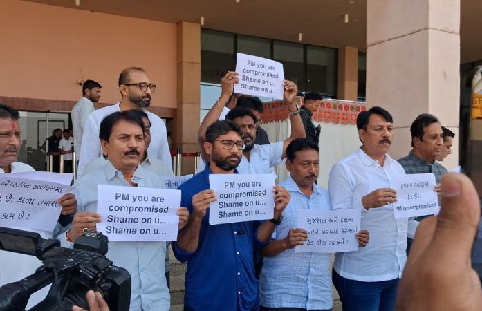 સત્ર શરુ થતાં પહેલા કોંગ્રેસના ધારાસભ્યોએ પક્ષના કાર્યાલયથી વિધાનસભાના પગથિયાં સુધી સૂત્રોચ્ચાર સાથે કૂચ કરી હતી. કોંગ્રેસ દ્વારા અમેરિકા સાથે થયેલી ટ્રેડ ડીલને રદ કરવાની માંગ સાથે દેખાવ કર્યો હતો. ધારાસભ્યોના હાથમાં 'PM કોમ્પ્રોમાઇઝ્ડ', 'ટ્રમ્પના દબાવમાં ડીલ' અને 'દેશને બરબાદ કરનારી ડીલ' જેવા લખાણવાળા પોસ્ટરો જોવા મળ્યા હતા. કોંગ્રેસનો દાવો છે કે આ ડીલને કારણે ગુજરાતના ઉદ્યોગકારો, ખેડૂતો અને નાના વેપારીઓને મોટું આર્થિક નુકસાન થશે. વિપક્ષે સરકાર પાસે આ ડીલની વિગતો જાહેર કરી પારદર્શિતા રાખવાની માંગ કરી છે.