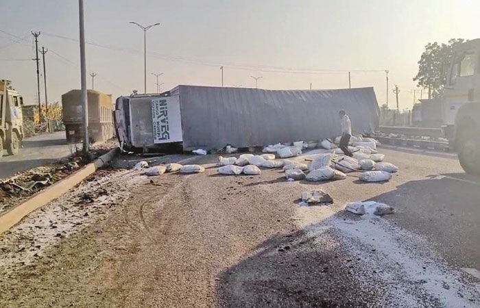 દાણા ભરેલા કન્ટેનરના ચાલકે સ્ટિયરિંગ પરનો કાબૂ ગુમાવતા કન્ટેનર પલટી મારી ગયું હતું