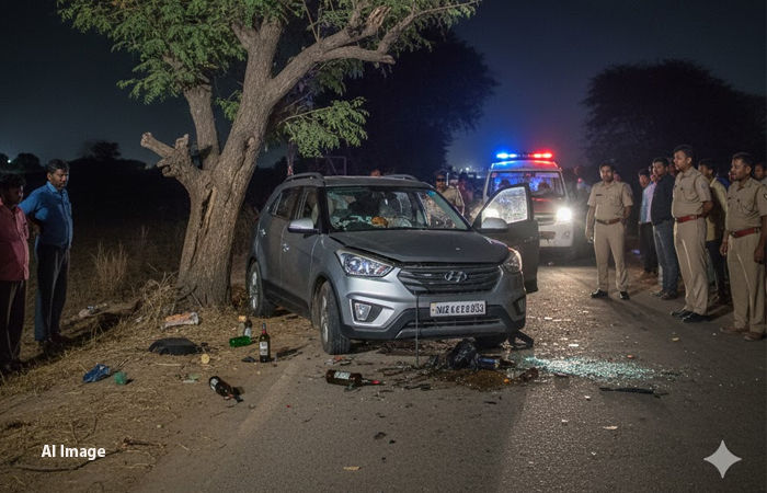 મળતી માહિતી અનુસાર કારમાં દારૂ ભરેલો હોવાથી કારચાલક પૂરપાટ ઝડપે જઈ રહ્યો હતો. આ દરમિયાન સ્ટીયરિંગ પરથી કાબૂ ગુમાવતા તેની કાર બેકાબૂ થઇને રોડની સાઈડમાં ઊતરી પડી હતી. જેના બાદ અનેક ગુલાટીઓ ખાઈને કાર સીધી ઝાડ સાથે ભટકાઈ હતી. આ ગમખ્વાર અકસ્માતમાં કારમાં સવાર બે લોકો ઘટનાસ્થળે જ મૃત્યુ પામી ગયા હતા. જ્યારે કારનો કચ્ચરઘાણ વળી ગયો હતો. હાલ મામલે ઘટનાસ્થળે પહોંચી પોલીસે દારૂ કબજે કરીને વધુ તપાસ હાથ ધરી છે.