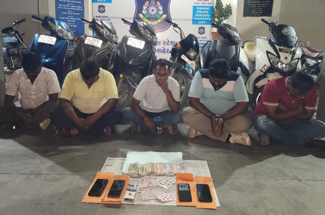 જ્યારે,ચિરાગ ઉર્ફે ખંભાતી જગદીશ ભાઇ રાણા(છાણી,રાણાવાસ),વીક્કી શર્મા (છાણી જકાતનાકા) અને કેવલ પૂનમભાઇ રાણા(છાણી ગામ)ની શોધખોળ જારી છે. પોલસે સ્થળ પરથી રોકડા રૃ. ૨૮૧૬૮, ચાર મોબાઇલ,સાત ટુવ્હીલર મળી રૃ.બે લાખની મતા કબજે કરી હતી.