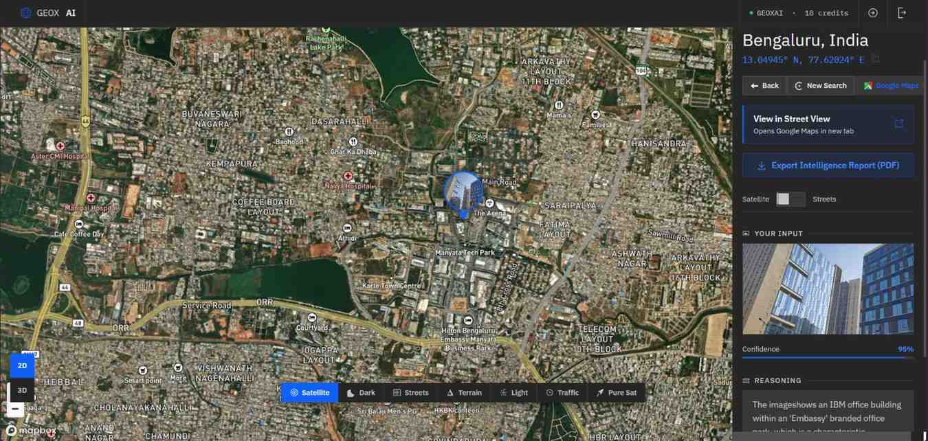 GEOX AI ટ્રેસએક્સ લેબ્સ દ્વારા વિકસાવવામાં આવ્યું છે, જે કમ્પ્યુટર વિઝન અને મલ્ટી-એજન્ટ AI સિસ્ટમના સંયોજનથી કાર્ય કરે છે. આ પ્લેટફોર્મ છબી અથવા વિડિઓમાં રહેલા પિક્સેલ-લેવલ ડીટેલ્સ જેમ કે ઈમારતોની આર્કિટેક્ચર, રસ્તાઓનું પેટર્ન, વૃક્ષો અને વનસ્પતિ, સાઇનબોર્ડ પરની ભાષા, પ્રકાશ-છાયાના ફેરફારો અને સાંસ્કૃતિક લક્ષણોનું ઊંડાણપૂર્વક વિશ્લેષણ કરીને ચોક્કસ ભૌગોલિક સ્થાન શોધી કાઢે છે. આ પ્રક્રિયા દ્વારા તે માત્ર સ્થાન જ નહીં પરંતુ આસપાસના લૅન્ડમાર્ક, સંભવિત કો-ઓર્ડિનેટ્સ અને વિશ્વસનીયતા સ્કોર પણ પ્રદાન કરે છે, જે તેને અત્યંત અદ્યતન ઇન્ટેલિજન્સ ટૂલ બનાવે છે.