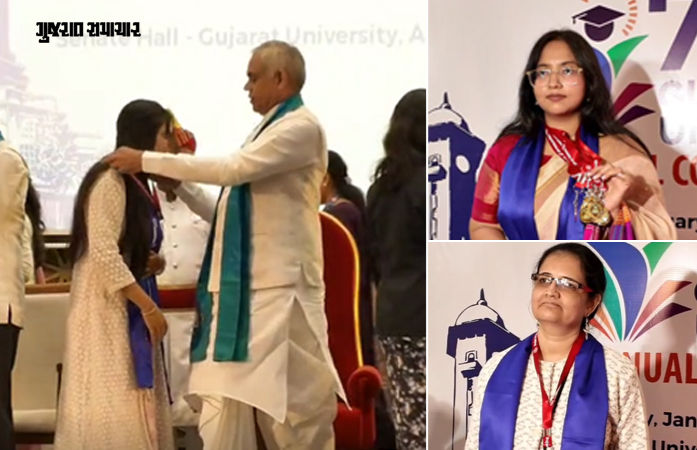 Ahmedabad News: આજે ગુજરાત યુનિવર્સિટીમાં 74મો પદવીદાન સમારંભ યોજાયો, જેમાં 40,800 જેટલા વિદ્યાર્થીઓ પદવી એનાયત કરવામાં આવી, જેમાં 350 વિદ્યાથીઓને ગોલ્ડ મેડલ પણ મળ્યા, આ સાથે ગૌરવ પુરસ્કારની પણ જાહેરાત કરી પ્રદાન કરવામાં આવ્યા. LLBમાં 8 મેડલ સાથે રવિના રાજપુરોહિત ટોપર બની તો ધૈર્યા માંકડે માત્ર 10 ટકા દ્રષ્ટિ હોવા છતાં સાત ગોલ્ડ મેડલ જીતી પ્રેરણાદાયી સફળતાનો નવો અધ્યાય રચ્યો.