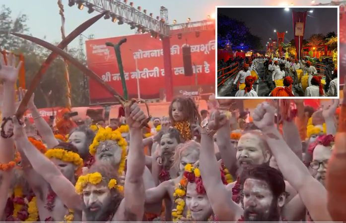Somnath Swabhiman Parv: હજારો વર્ષોથી કરોડો લોકોની આસ્થાના કેન્દ્ર સમાન સોમનાથ મહાદેવના મંદિર પર થયેલા હિંસક આક્રમણના 1000 વર્ષ અને મંદિરના અંતિમ પુનઃનિર્માણના 75 વર્ષ નિમિત્તે સોમનાથમાં ભવ્ય 'સોમનાથ સ્વાભિમાન પર્વ'ની ઉજવણી શરૂ થઈ છે. આ મહોત્સવના પ્રથમ દિવસે સોમનાથના ઈતિહાસમાં પહેલીવાર નાગા બાવાઓની ભવ્ય રવાડી નીકળતા સમગ્ર સોમનાથ નગરી શિવમય બની હતી.