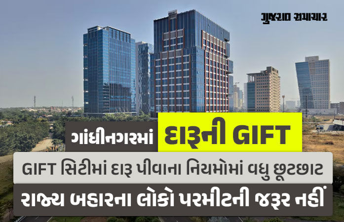 ગાંધીનગરના ગિફ્ટ સિટીમાં હવે દારૂ પીવાની છૂટછાટ વધારાઈ છે. ગત શનિવારે જાહેર કરાયેલા નોટિફિકેશન મુજબ, જે વ્યક્તિઓ બહારના છે અને ગુજરાતના રહેવાસી નથી તેઓને દારૂ પીવા માટે પરમિટની જરૂર રહેશે નહીં. આમ અન્ય રાજ્યના લોકો અને વિદેશી નાગરિક પોતાનું માન્ય ફોટો ઓળખપત્ર બતાવીને GIFT સિટીમાં દારૂ પી શકશે. આ લોકોને અલગથી પરમિટ લેવાની જરૂર નહીં રહે. આ નિર્ણય 30 ડિસેમ્બર 2023ના રોજ જાહેર કરાયેલા છૂટછાટને વધુ વિસ્તૃત કરે છે.