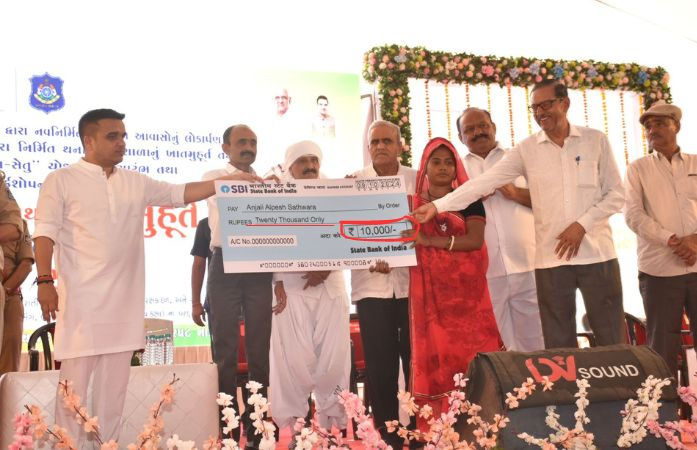 ગૃહ રાજ્યમંત્રી હર્ષ સંઘવી દ્વારા લાભાર્થીઓને આપવામાં આવેલા પ્રતિકાત્મક એક ચેકમાં આંકડો 10,000 લખાયો હતો, પરંતુ એજ ચેકમાં શબ્દોમાં તે રકમ વીસ હજાર લખાયેલી હતી. એ જ રીતે અન્ય એક ચેકમાં આંકડામાં 50,000 રકમ લખી હતી, જ્યારે શબ્દોમાં વીસ હજાર લખેલા જોવા મળ્યા.