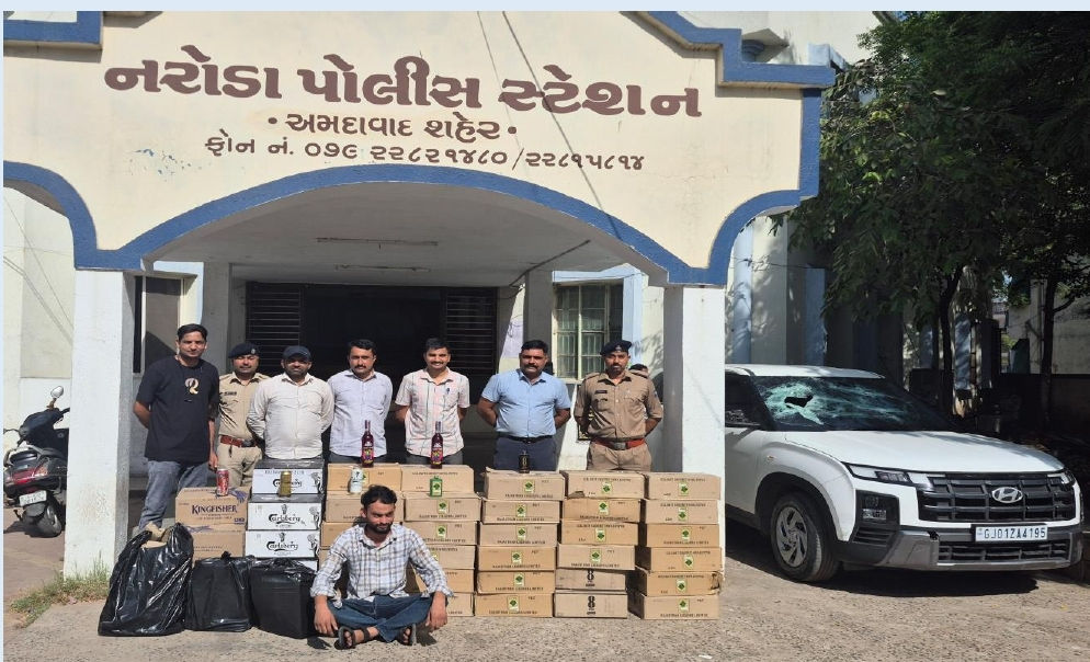 કારની અંદરથી અલગ-અલગ બ્રાન્ડની વિદેશી દારૂની કુલ 2,500 બોટલો મળી આવી હતી, જેની બજાર કિંમત આશરે 6,54,000 આંકવામાં આવી છે. પોલીસે આ મામલે કાર ચાલક અયાનઅહેમદ ફારૂક કાદરી (રહે. કાશીરામ મામાની ચાલી, નરોડા)ની સ્થળ પર જ ધરપકડ કરી હતી. પોલીસે 6.54 લાખનો દારૂ અને 10 લાખની કિંમતની ક્રેટા કાર મળીને કુલ 17 લાખથી વધુનો મુદ્દામાલ જપ્ત કર્યો છે. આરોપીની પ્રાથમિક પૂછપરછમાં જાણવા મળ્યું છે કે આ દારૂનો જથ્થો રાજસ્થાનથી લાવવામાં આવ્યો હતો અને તેને સ્થાનિક સ્તરે સપ્લાય કરવાનો હતો. આ ગુનામાં અન્ય કોણ-કોણ સંડોવાયેલું છે અને દારૂ કોને પહોંચાડવાનો હતો તે દિશામાં નરોડા પોલીસે તપાસ તેજ કરી છે.