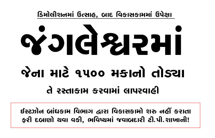 બીજી તરફ, વિકાસકામોમાં ઉપેક્ષા રખાતા અને ડિમોલીશનમાં જ રસ લેવાતા આ વિસ્તાર હાલ ખંડેર જેવો બની ગયો છે અને કેટલાક બાંધકામો ફરી થવા લાગ્યાની વિગતો પણ બહાર આવી છે.અગાઉ શહેરમાં અનેક સ્થળે ડિમોલીશન કર્યા બાદ ત્યાં ડેવલપમેન્ટ નહીં થતા ફરી દબાણો થયા છે અને જંગલેશ્વરમાં પણ ફરી દબાણો થાય તો અંતે જવાબદારી ટી.પી.વિભાગની આવતી રહે છે ત્યારે આ અંગે સમયમર્યાદા સાથે દબાણ થવા માટે તેમજ જે હેતુ માટે દબાણ હટાવાય ત્યાં કામ માટે જે તે શાખાની જવાબદારી ફીક્સ કરી વહીવટદાર અને કમિશનરે પગલા લેવાની જરૂર છે.
