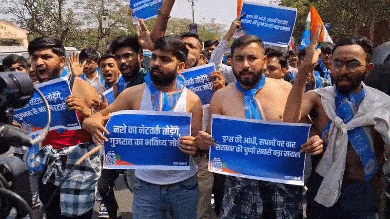 રાજ્યના યુવાધનને બરબાદ કરી રહેલા ડ્રગ્સ અને દારૂના દૂષણને રોકવામાં સરકાર નિષ્ફળ રહી હોવાના આક્ષેપ સાથે NSUIના કાર્યકરો મંગળવારે રસ્તા પર ઉતર્યા હતા. આ દેખાવને વધુ તેજ બનાવવા માટે કાર્યકરોએ કપડાં ઉતારી અર્ધનગ્ન હાલતમાં દેખાવ કર્યો હતો. કાર્યકરોએ જણાવ્યું હતું કે, ગુજરાતમાં શિક્ષણના ધામો સુધી નશો પહોંચી રહ્યો છે, જે ચિંતાનો વિષય છે.