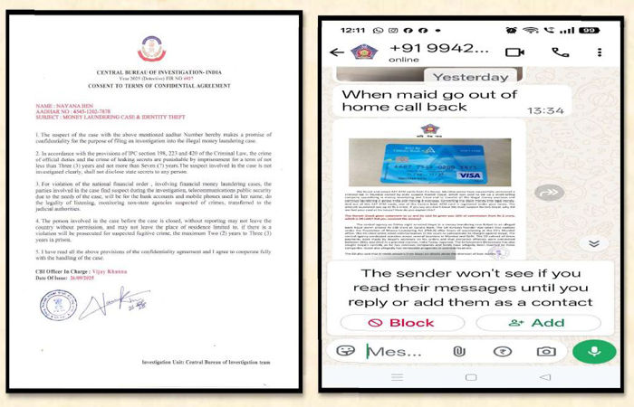 ભરૂચમાં સિનિયર સિટીઝન દંપતીને "ડિજિટલ અરેસ્ટ"ના ગંભીર કિસ્સામાંથી પોલીસએ બચાવ્યા હતા. 76 વર્ષીય નયનાબેન બિપીનચંદ્ર શાહને 26 સપ્ટેમ્બરે મુંબઈ પોલીસના લોગો વાળા નંબરથી વોટ્સએપ કોલ આવી મની લોન્ડ્રિંગના કેસમાં તેમનું નામ હોવાનું જણાવાયું. સામેવાળી વ્યક્તિએ જણાવ્યું હતું કે, નયનાબેનના આધાર કાર્ડ વડે 538 કરોડનો ફ્રોડ થયો છે અને તેઓને તપાસ પૂરું ન થાય ત્યાં સુધી ડિજિટલ અરેસ્ટમાં રહેવું પડશે. ગભરાયેલ દંપતીએ ભરૂચ સાયબર ક્રાઈમ પોલીસનો સંપર્ક કર્યો. પોલીસે સમજાવી સિનિયર સિટીઝનને છેતરપિંડીમાંથી સુરક્ષિત કર્યા અને લોકોને આવા કૉલથી સાવચેત રહેવા અપીલ કરી.