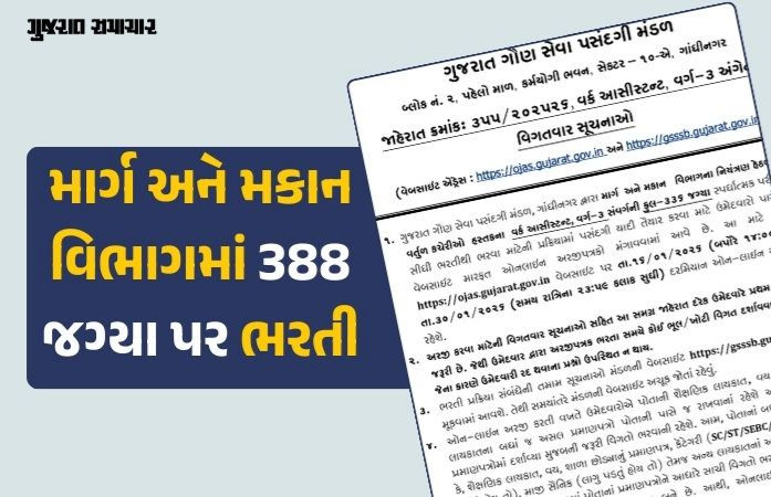 GSSSB Recruitment 2026: ગુજરાત ગૌણ સેવા પસંદગી મંડળ(GSSSB) દ્વારા માર્ગ અને મકાન વિભાગમાં વર્ક આસિસ્ટન્ટ અને રેખનકાર વર્ગ-3ના પદ પર કુલ 388 જગ્યા પર ભરતી પ્રક્રિયાને લઈને જાહેરાત કરવામાં આવી છે. ભરતી માટે લાયકાત ધરાવતા ઉમેદવારો 16 જાન્યુઆરીથી 30 જાન્યુઆરી દરમિયાન OJAS પરથી ઓનલાઇન અરજી કરી શકશે.
