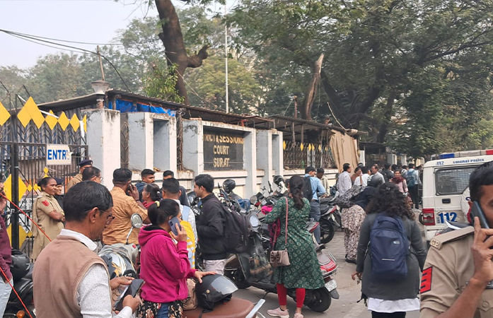 Bomb Threat at Surat District Court: ગુજરાતમાં સરકારી સંસ્થાઓને બોમ્બથી ઉડાવી દેવાની ધમકીઓનો સિલસિલો અટકવાનું નામ નથી લઈ રહ્યો. હવે ગુજરાત હાઇકોર્ટ સહિત સુરત ડિસ્ટ્રિક્ટ કોર્ટ, લાલ દરવાજા સ્થિત અમદાવાદ સિટી સિવિલ ઍન્ડ સેશન્સ કોર્ટ તેમજ ભરુચ, આણંદ અને રાજકોટની કોર્ટને બોમ્બથી ઉડાવી દેવાનો ધમકીભર્યો ઈ-મેલ મળતાં ભારે ખળભળાટ મચી ગયો છે. એક અજાણ્યા શખ્સે સોમવારે મોડી રાત્રે સુરત અને અમદાવાદ સહિતની કોર્ટના ઓફિશિયલ આઇડી પર મેલ કરીને આખા બિલ્ડિંગને RDXથી ઉડાવી દેવાની ધમકી આપી હતી. આ ધમકીને ગંભીરતાથી લઈને તમામ કોર્ટમાં ન્યાયિક કામગીરી અટકાવીને ડોગ અને બોમ્બ ડિસ્પોઝલ ટીમની મદદથી ઝીણવટભરી તપાસ કરાઈ રહી છે.