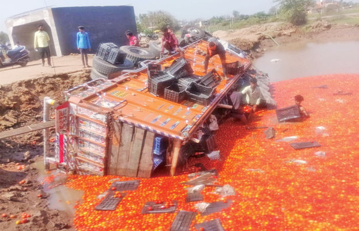 આ સ્થળે કેનાલનું પાણી ભરાયેલું હોવાથી આસપાસની માટી અત્યંત પોચી પડી ગઈ હતી. બુધવારની સાંજે આ માર્ગ પરથી ૭૪૧ કેરેટ ટામેટા ભરીને એક ટ્રક પસાર થઈ રહી હતી, ત્યારે અચાનક રોડની સાઈડની માટી ધસી પડી હતી. માટી ધસતાની સાથે જ ટ્રક સીધી ઊંડા પાણી ભરેલા કાંસમાં ખાબકી હતી. ટ્રક પલટી મારી જતાં તેમાં ભરેલા તમામ ટામેટા પાણીમાં વેરાઈ ગયા હતા. અકસ્માતને પગલે આસપાસના લોકો તાત્કાલિક ઘટનાસ્થળે દોડી આવ્યા હતા. સદનસીબે ટ્રક ચાલક અને તેમાં સવાર મજૂરો સમયસર બહાર નીકળી જવામાં સફળ રહ્યા હતા, જેથી મોટી જાનહાનિ ટળી હતી. જોકે, ટામેટાનો આખો જથ્થો બગડી જતાં ખેડૂતને ભારે આથક ફટકો પડયો છે.