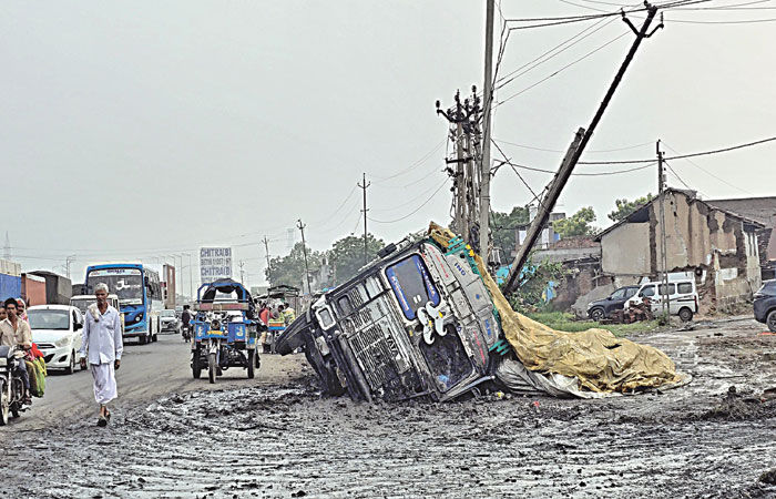 કોન્ટ્રાક્ટરની બદરકારીના કારણે ખુલ્લી ગટરમાં ટ્રક ગટરમાં ઉતરી જતા પલટી મારી ગયો