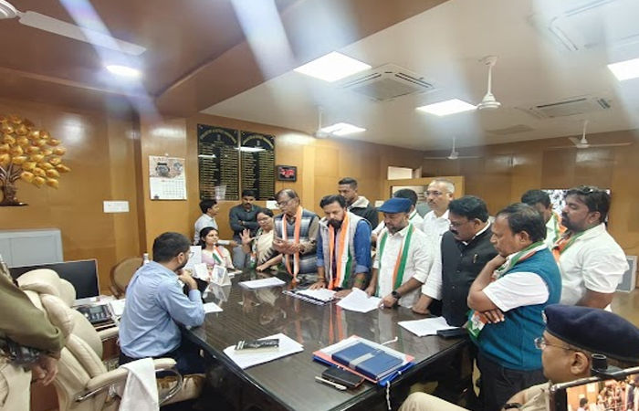 વડોદરા જિલ્લા કલેકટર કચેરીએ મોટી સંખ્યામાં કોંગ્રેસી કાર્યકરો સહિત શહેર કોંગ્રેસ પ્રમુખ ઋત્વિજ જોશી, પાલિકા વિરોધ પક્ષના ચંદ્રકાંત ભથ્થુ, મહિલા કોર્પોરેટર અમી રાવત તથા જશપાલ પઢીયાર સહિત મોટી સંખ્યામાં કોંગ્રેસી કાર્યકરોએ જિલ્લા કલેકટર કચેરી સંકુલ ફોર્મ નં.7ના ફ્રોડના નારાથી ગજાવી ભારે વિરોધ સાથે કલેક્ટર કચેરીએ ઉગ્ર રજૂઆતો કરી હતી.