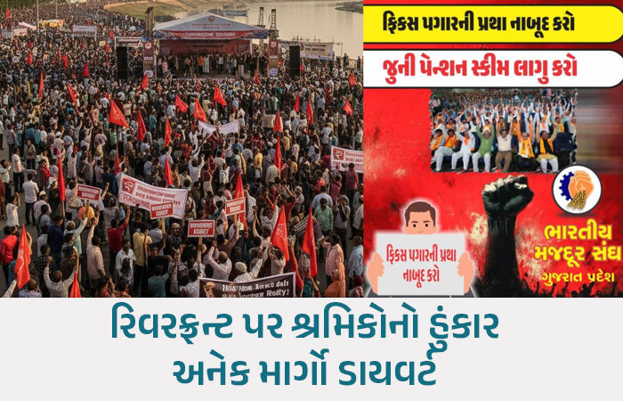 Worker Protest in Ahmedabad Riverfront: પોતાના લાંબા સમયથી પડતર પ્રશ્નો અને માંગણીઓના ઉકેલ માટે આજે ભારતીય મજદૂર સંઘ (BMS) ના નેજા હેઠળ અમદાવાદના રિવરફ્રન્ટ ખાતે વિશાળ 'શ્રમિક આક્રોશ રેલી'નું આયોજન કરવામાં આવ્યું હતું. ભારતીય મજદૂર સંઘ સાથે જોડાયેલાં 161 યુનિયનો અને મહાસંઘના હજારો કાર્યકરો બહોળી સંખ્યામાં 'ભારત માતા કી જય' ના નારા સાથે ઉમટી પડ્યા હતા અને સરકાર સામે ઉગ્ર દેખાવો કર્યા હતા. બીજી તરફ, પગાર વધારા મુદ્દે હાઇકોર્ટના આદેશનું પાલન ન થતાં આંગણવાડી બહેનોએ પણ આંદોલન ઉગ્ર બનાવ્યું છે અને આગામી ૧લી ડિસેમ્બરથી 1000 બહેનોની ભૂખ હડતાળનું એલાન કર્યું છે. વિવિધ યુનિયનો પોતપોતાના કર્મચારીઓ સાથે નાની-નાની રેલી સ્વરૂપે રિવરફ્રન્ટ પર પહોંચ્યા હતા, જ્યાં આ તમામ રેલીઓ એક મહાસંમેલનમાં ફેરવાઈ હતી. દરેક સંગઠને પોતાના પડતર પ્રશ્નોને લઈને સરકારની નીતિઓ સામે આક્રોશ વ્યક્ત કર્યો હતો.