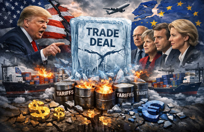 અમેરિકા અને યુરોપ વચ્ચેના વ્યાપારિક સંબંધોમાં તિરાડ પડવાની શરુઆત ત્યારે જ થઈ ગઈ હતી જ્યારે ટ્રમ્પે ગ્રીનલૅન્ડના મુદ્દે આક્રમક વલણ અપનાવ્યું હતું. વાસ્તવમાં, ટર્નબેરી કરાર એ ડોનાલ્ડ ટ્રમ્પ અને યુરોપિયન યુનિયન વચ્ચેની એક અત્યંત મહત્ત્વની 'મહા-ડીલ' હતી, જેનું આયોજન ટ્રમ્પે પોતે સ્કોટલૅન્ડ સ્થિત તેમના ટર્નબેરી ગોલ્ફ રિસોર્ટમાં કર્યું હતું. આ કરારનો મુખ્ય ઉદ્દેશ્ય અમેરિકા અને યુરોપમાં કાર તથા ટૅક્નોલૉજી પરના ટેક્સ ઘટાડીને ચીન સામે એક સશક્ત આર્થિક મોરચો તૈયાર કરવાનો હતો. જોકે, હવે યુરોપિયન યુનિયને આ કરારને 'ફ્રીઝ'(સ્થગિત) કરી દેતા, કરોડો ડૉલરનો વેપાર જોખમમાં મૂકાયો છે અને આ સ્થિતિ એક ભયાનક ગ્લોબલ ટ્રેડ વોર તરફ ઈશારો કરી રહી છે.
