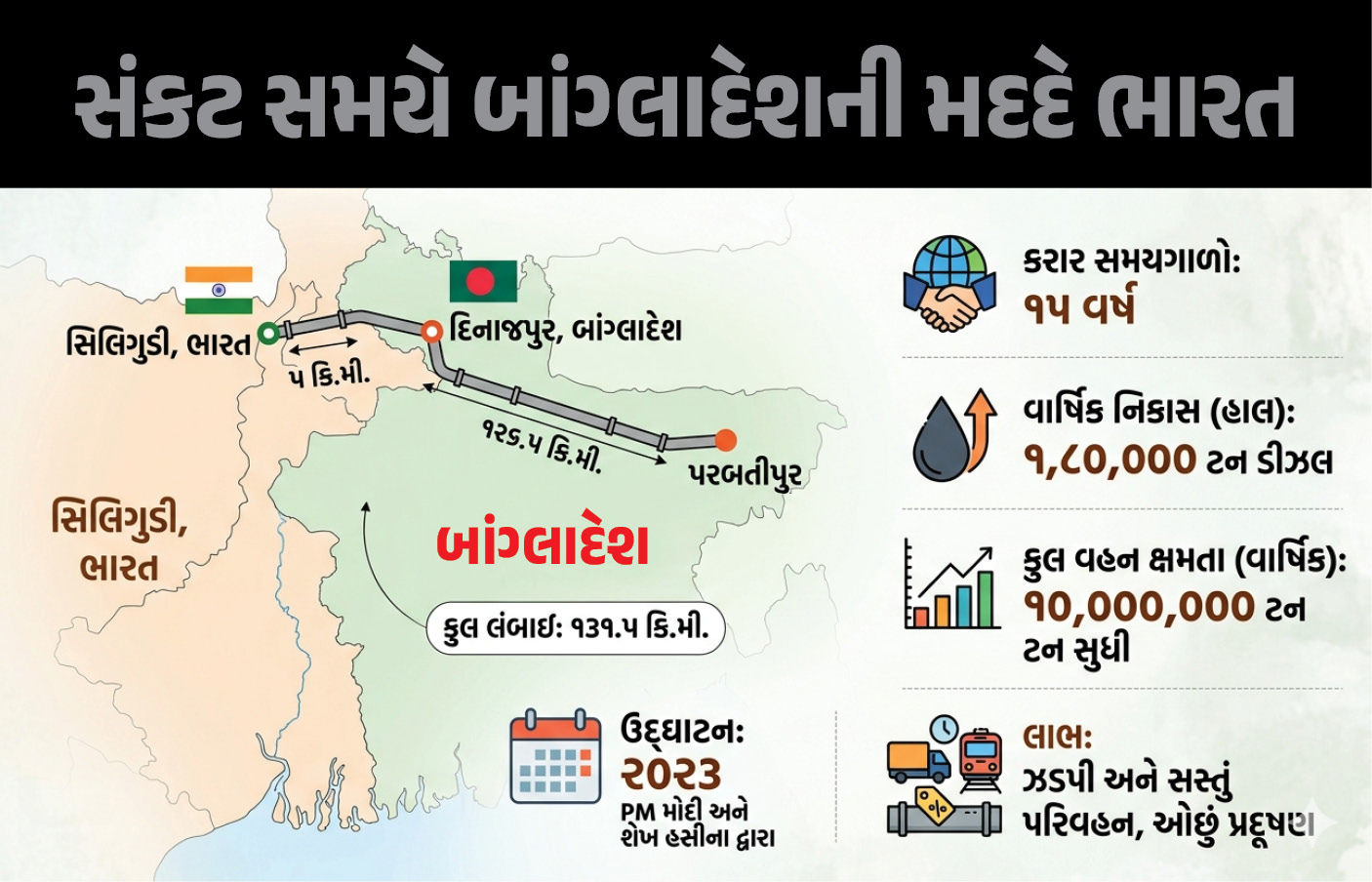 માર્ચ 2026 દરમિયાન, બાંગ્લાદેશમાં ગંભીર ઊર્જા કટોકટી હતી. ભારતે આ પાઇપલાઇન દ્વારા એક મહિનામાં જ લગભગ 17,000 ટન ડીઝલ મોકલી આપ્યું. આમાં 5,000 અને 7,000 ટનના બે બેચનો સમાવેશ થાય છે. આ પુરવઠાને કારણે બાંગ્લાદેશને મોટી રાહત મળી છે.