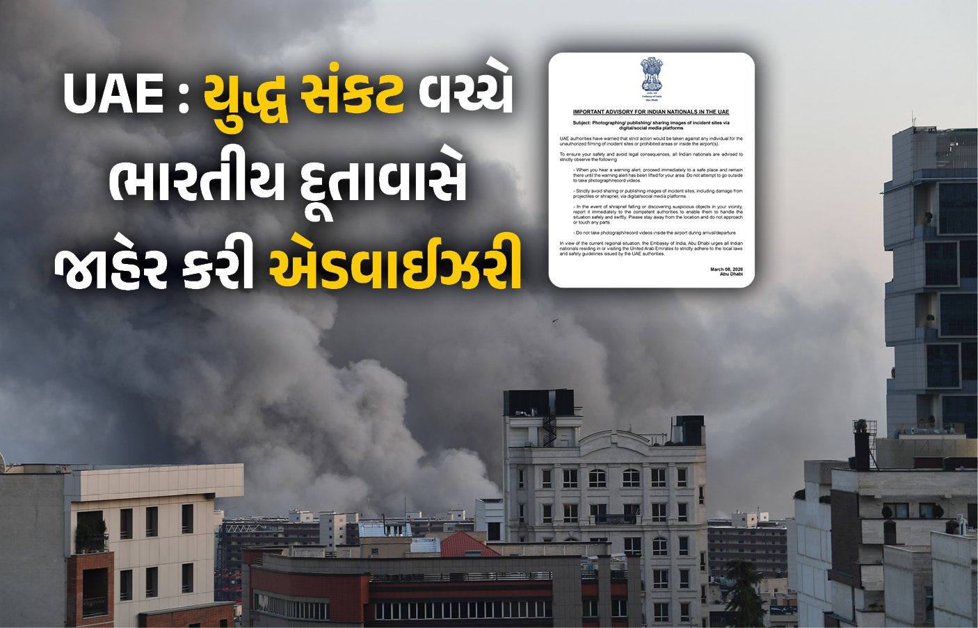 Indian Embassy UAE Advisory : અમેરિકા-ઈઝરાયલના ઈરાન પર હુમલા અને ઈરાન દ્વારા પડોશી દેશો પર આક્રમણને ધ્યાને રાખીને ભારત વિદેશમાં વસતા ભારતીયોની સુરક્ષા માટે એલર્ટ થઈ ગયું છે. સંયુક્ત આરબ અમીરાત (UAE)ના અબુધાબી સ્થિત ભારતીય દુતાવાસે ભારતીયો સામે ચેતવણી જાહેર કરી છે. દુતાવાસે કહ્યું છે કે, ઘટના સ્થળો પર ફોટો કે વીડિયો બનાવવા ન જાવ, ઘટનાઓના ફોટો અને વીડિયો સોશિયલ મીડિયા પર પણ અપલોડ ન કરો. ઉલ્લેખનીય છે કે, અમેરિકા, ઈઝરાયલ અને ઈરાન વચ્ચે સતત 9 દિવસથી ભયંકર યુદ્ધ ચાલી રહ્યું છે. સતત ડ્રોન અને મિસાઈલો ઝિંકાયા બા ઈરાનની બદતર સ્થિતિ થઈ ગઈ છે, તો ઈરાન પણ વળતો જવાબ આપવાની સાથે પડોશી દેશો પર પણ હુમલાઓ કરી રહ્યું છે. યુદ્ધના કારણે મિડલ ઈસ્ટમાં ગંભીર સંકટ ઉભુ થઈ ગયું છે.