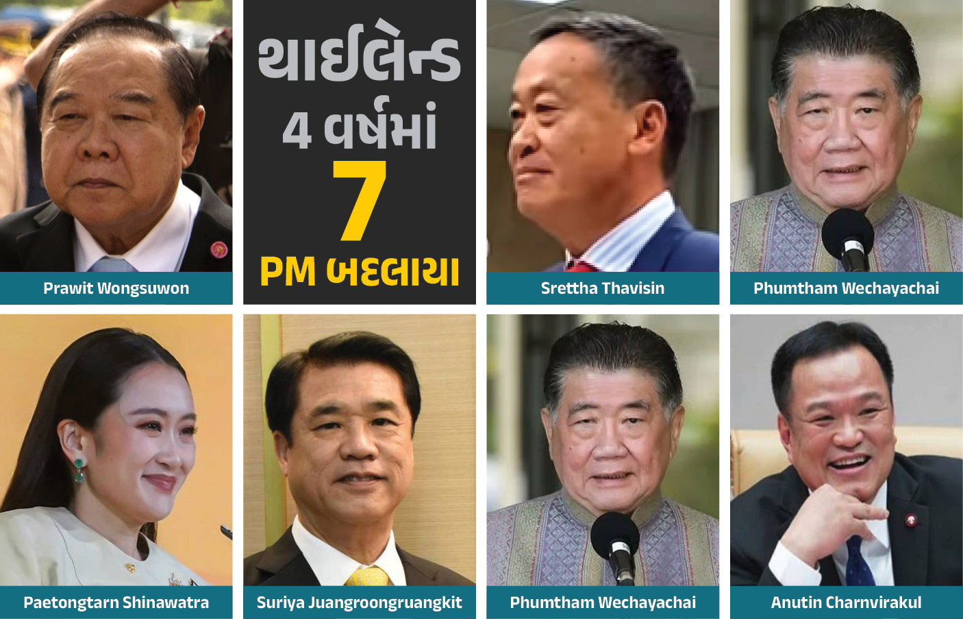 • પૈતોંગતારણ શિનાવાત્રા (Paetongtarn Shinawatra)એ 16 ઑગસ્ટ-2024ના રોજ સત્તા સંભાળી અને તેઓ 29 ઑગસ્ટ-2025 સુધી વડાપ્રધાન પદે રહ્યા, જે કુલ 1 વર્ષ અને 13 દિવસ જેટલો સમયગાળો છે.