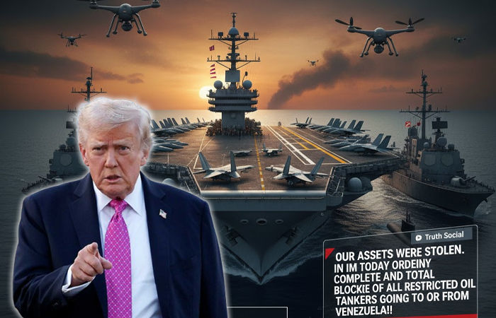 ટ્રમ્પે આક્રમક રીતે લખ્યું છે કે વેનેઝુએલા સરકારને "અમારી સંપત્તિની ચોરી, આતંકવાદ, ડ્રગ્સની તસ્કરી અને માનવ તસ્કરી સહિતના અન્ય ઘણા કારણોસર" વિદેશી આતંકવાદી સંગઠન (Foreign Terrorist Organization) જાહેર કરવામાં આવી છે. આ ઘોષણાના પગલે, ટ્રમ્પે તાત્કાલિક અસરથી વેનેઝુએલામાં આવતા-જતા તમામ પ્રતિબંધિત ઓઇલ ટેન્કરોની સંપૂર્ણ નાકાબંધી (Total Blockade) કરવાનો આદેશ આપ્યો છે.