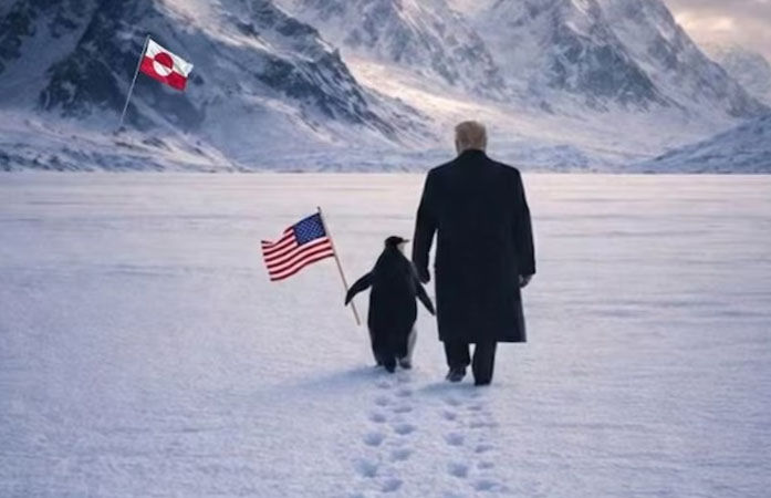 Trump joins Penguin meme trend: અમેરિકન પ્રમુખ ડોનાલ્ડ ટ્રમ્પ ઘણા સમયથી ગ્રીનલેન્ડને અમેરિકાના નિયંત્રણમાં લાવવા માટે ઉત્સુક છે અને તેને રાષ્ટ્રીય સુરક્ષા માટે મહત્ત્વનું ગણાવે છે. આ વિષયને લઈને વ્હાઇટ હાઉસ દ્વારા શનિવારે સોશિયલ મીડિયા પર એક ફોટો શેર કરવામાં આવ્યો હતો, જેમાં ટ્રમ્પ એક પેંગ્વિન સાથે ગ્રીનલેન્ડ તરફ આગળ વધતા દેખાય છે અને સાથે 'એમ્બ્રેસ ધ પેંગ્વિન'(પેંગ્વિનને અપનાવો) એવું કેપ્શન પણ લખ્યું હતું. જોકે, ગ્રીનલેન્ડમાં પેંગ્વિનનું અસ્તિત્વ જ ન હોવાથી, વ્હાઇટ હાઉસની આ પોસ્ટ ગણતરીની મિનિટોમાં જ સોશિયલ મીડિયા પર ભારે મજાકનું કારણ બની ગઈ હતી.