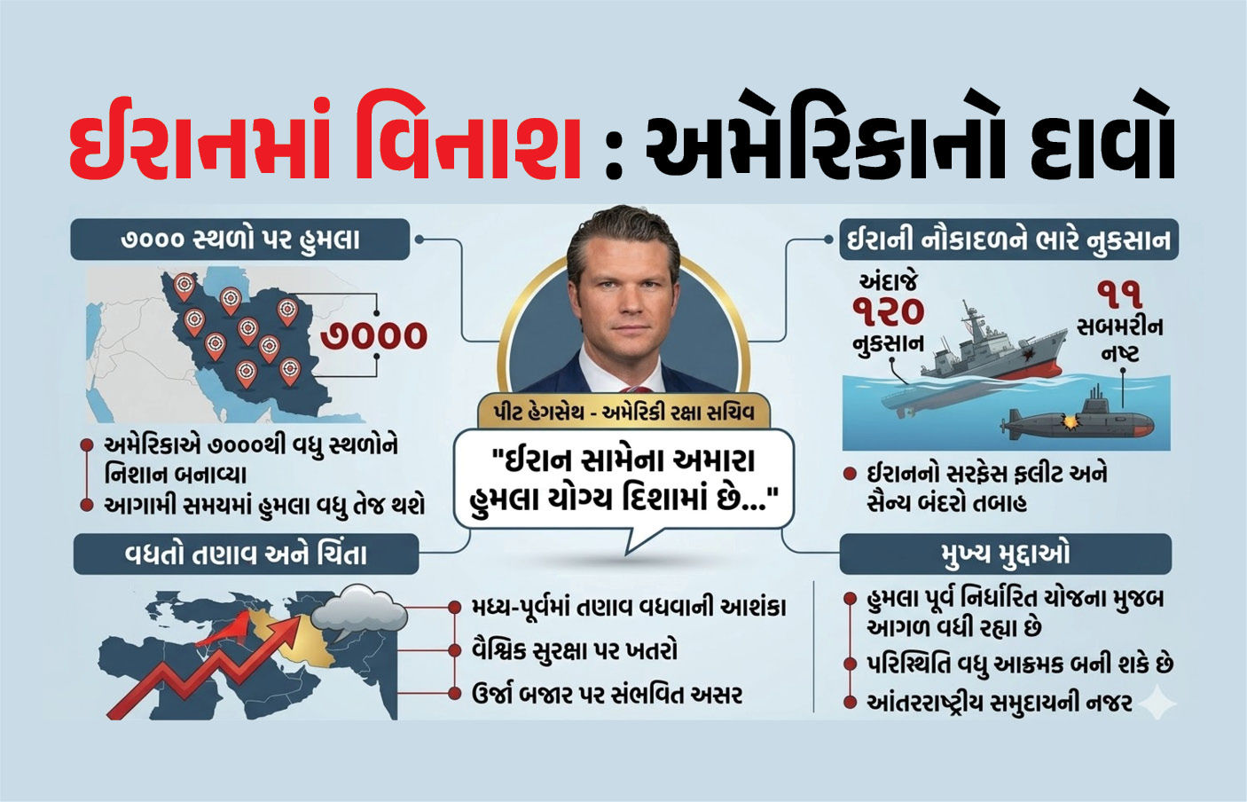 રક્ષા સચિવના જણાવ્યા અનુસાર અમેરિકાએ અત્યાર સુધીમાં ઈરાનમાં અંદાજે 7000 જેટલા સ્થળોને નિશાન બનાવ્યા છે. તેમણે સંકેત આપ્યો છે કે આગામી સમયમાં હુમલાઓ વધુ તેજ કરવામાં આવશે અને અત્યાર સુધીનો સૌથી મોટો હુમલો કરવામાં આવી શકે છે.