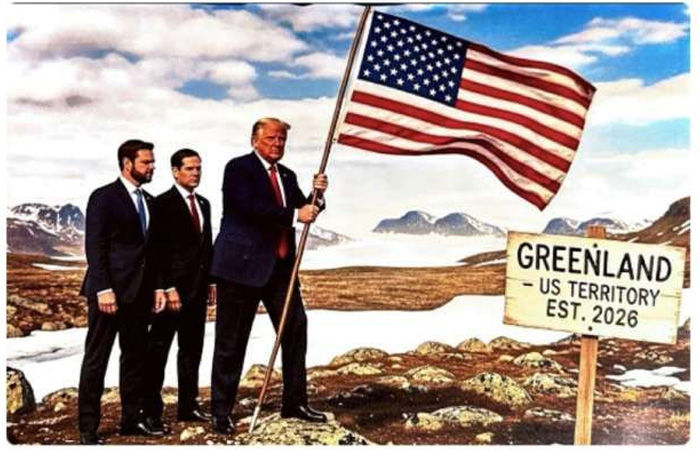 Donald Trump: અમેરિકન પ્રમુખ ડોનાલ્ડ ટ્રમ્પ સતત ગ્રીનલેન્ડ પર દાવો કરી રહ્યા છે. બીજી તરફ હવે ગ્રીનલેન્ડને લઈને યુરોપ અને અમેરિકા આમને-સામને આવી ગયા છે. હવે આ સમગ્ર ઘટના વચ્ચે ડોનાલ્ડ ટ્રમ્પે સોશિયલ મીડિયા પ્લેટફોર્મ ટ્રુથ સોશિયલ પર એક તસવીર શેર કરી છે. આ તસવીર જોયા બાદ હવે ડેનમાર્ક સહિત અનેક યુરોપિયન દેશોમાં ચિંતા વધી ગઈ છે. ડોનાલ્ડ ટ્રમ્પ આ તસવીરમાં ગ્રીનલેન્ડમા અમેરિકાનો ઝંડો લગાવતા દેખાઈ રહ્યા છે. આ તસવીરમાં ટ્રમ્પ સાથે જેડી વાન્સ અને માર્ક રુબિયો પણ જોવા મળે દેખાઈ રહ્યા છે. બીજી તરફ તસવીરમાં એક બોર્ડ પર લખેલું છે, "ગ્રીનલેન્ડ - યુએસ ટેરિટરી - EST 2026".