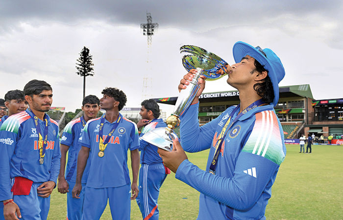 હરારે : વૈભવ સૂર્યવંશીએ વિસ્ફોટક બેટિંગ સાથે ઇંગ્લેન્ડને ધરાશાયી કરીને ભારતને અંડર-૧૯ વર્લ્ડ કપમાં ચેમ્પિયન બનાવવાાં મહત્તમ યોગદાન આપ્યું હતું. વૈભવ સૂર્યવંશીએ ૧૫ ચોગ્ગા, ૧૫ છગ્ગા સાથે ૮૦ બોલમાં ૨૧૮.૭૫ના સ્ટ્રાઇક રેટ સાથે ૧૭૫ રન ફટકારી ઇંગ્લેન્ડને હતપ્રભ તો કરી જ દીધું હતું પણ ભારતે વૈભવની આવી બેટિંગના લીધે ૫૦ ઓવરમાં ૯ વિકેટે ૪૧૧ રનનો જંગી અને ઇંગ્લેન્ડને આંખે અંધારા લાવી દેતો સ્કોર કર્યો હતો. ઇંગ્લેન્ડ જવાબમાં ૪૦.૨ ઓવરોમાં ૩૨૧ રનમાં ઓલઆઉટ થયું હતું. તેના પરથી સ્પષ્ટ પુરવાર થયું હતું કે, બંને ટીમ વચ્ચે વૈભવની ઇનિંગનો જ ફર્ક હતો.